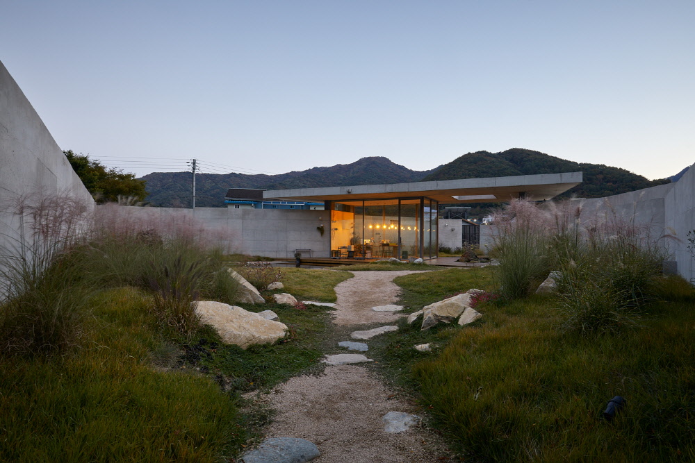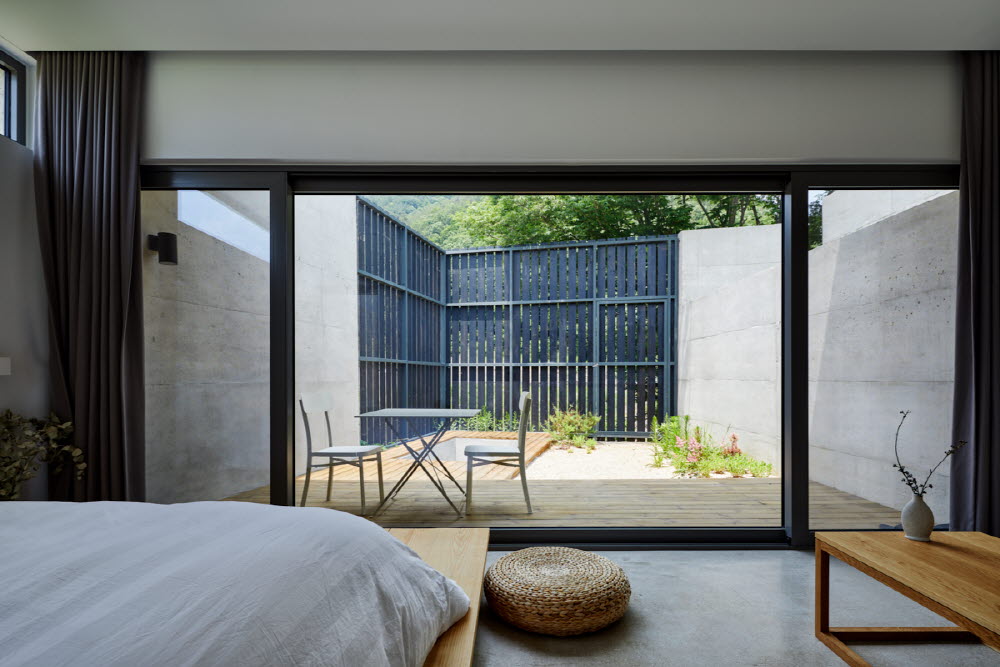 This place is not shown everything from beginning to till the end. It is not easy to see the entry location when you get into this place as what you can see in the entry sequence is only one large and big chunk of concrete wall piece. This kind of unexpectable circumstance will give you sense of anxiety and nervousness. However, this sense will be change to the pleasurable sensation when you turn the corner of concrete wall and meet the water garden. It’s hard to guess the room location from the outside as room sits along the site shape and topography which create background walls within the nature. Furthermore, you can’t see the full wall shape as some parts of walls are buried in the ground. The pathway to the guestroom is designed as narrow as possible, so the guests can see their own space only when they enter the guestroom through the narrow pathway. Each guestroom can see the different scenery from their own courtyard depending on the height of the ground, the height of the walls, the different gap space, and the angle of each space. Especially, sounds of nature come through the small courtyard will make the guest feel peaceful such as the sound of water in the valley, the singing of the mountain birds, and the falling rain. Gucheon-dong in Muju is well known for backwoods town in the mountains far from the world for a long time. Those who come to Seorimyeonga in Gucheon-dong, from a city away, would be able to hide from the crowded world and enjoy real relaxation by entering their secret space in nature. |
